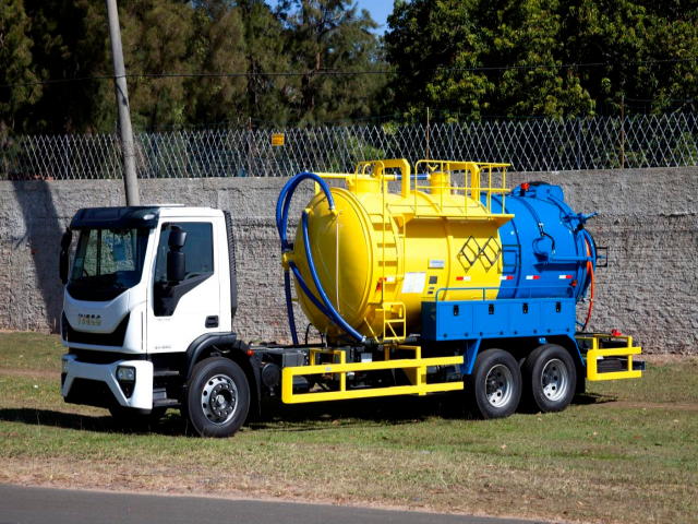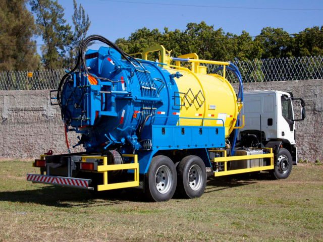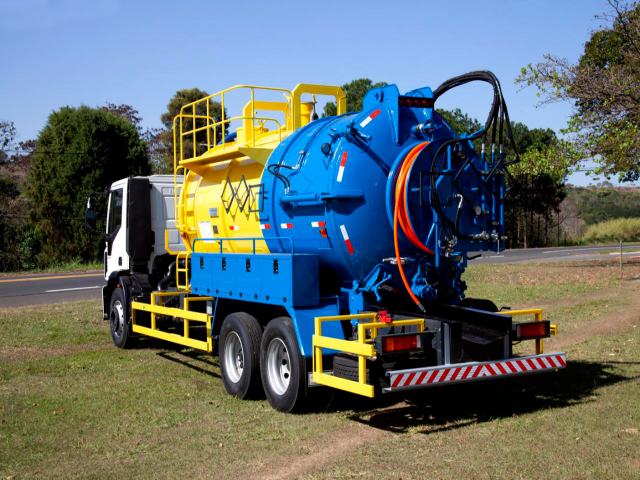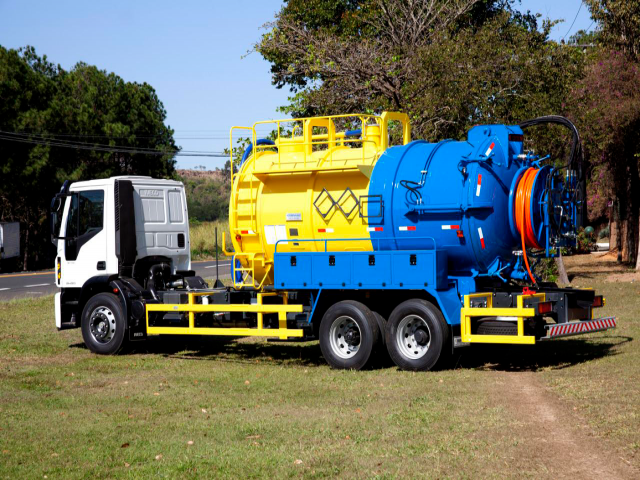 Equipamento Combinado de hidrojateamento sob alta pressão e sucção a alto vácuo modelo ELPV-135, marca SIBRAVAC, para desobstrução e limpeza de redes de esgoto, poços de visita e galerias de águas pluviais, instalado sobre chassi de caminhão fornecido pelo Cliente, de modo a torná-lo transportável.