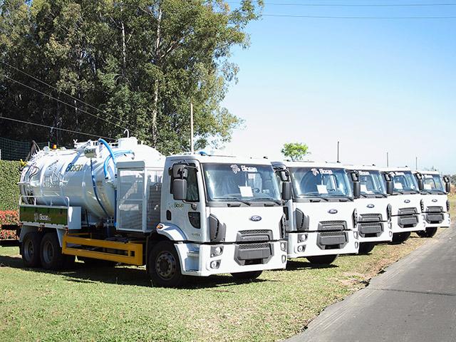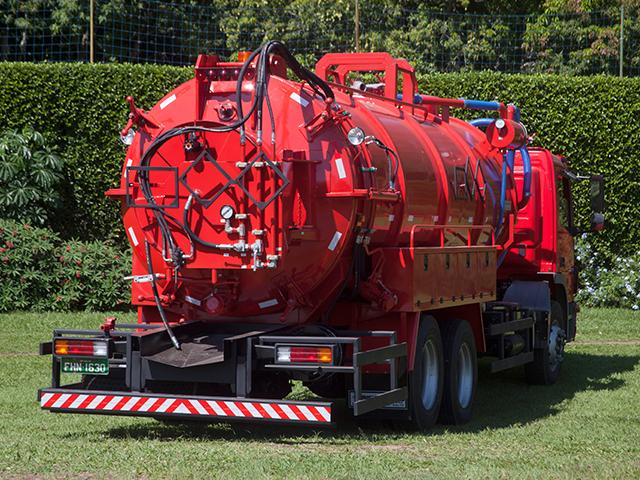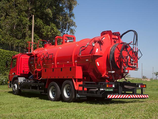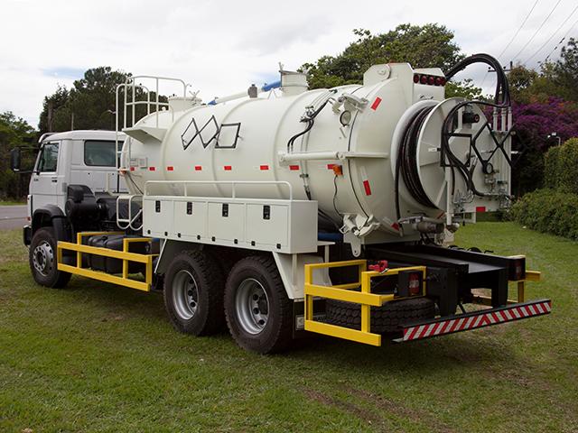 Tanque em formato cilíndrico e tampos abaulados, construído em chapa de aço carbono de espessura 3/16” (4,76 mm) e reforçado externamente com cintas de viga “U” laminada, dividido em dois compartimentos sendo, um na parte dianteira destinado a água de hidrojateamento e outros na parte traseira para armazenamento dos detritos coletados por sucção, equipado com os seguintes acessórios: