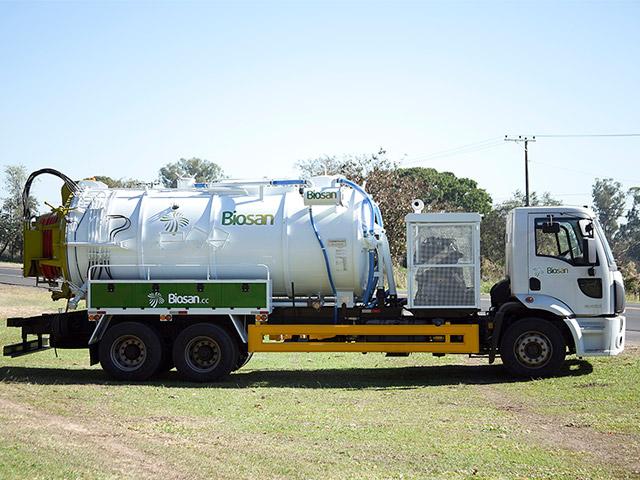 Bomba de Vácuo de anel líquido modelo MS-720AL para operar com deslocamento de ar de 12 m3/minuto, pressão de vácuo de 720 mm.Hg (9,5 m.c.a.) e pressão positiva de 1,0 Kgf/cm2, acionada por polias e correias com sistema de transmissão a partir de tomada de força de engate pneumático acoplada na caixa de câmbio do próprio caminhão.