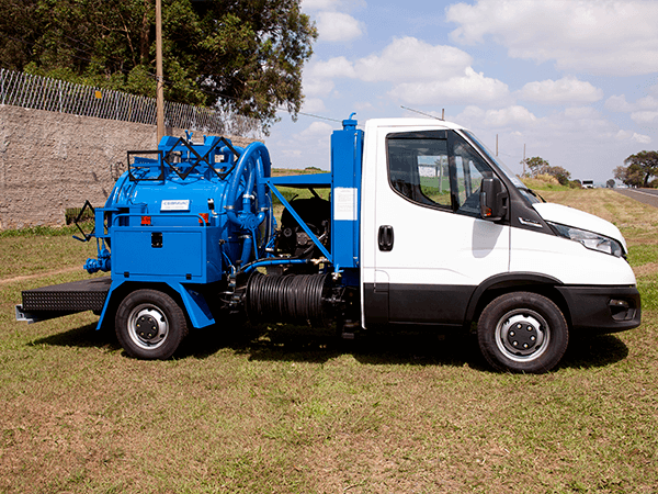 Tanque em formato cilíndrico e tampos abaulados, construído em chapa de aço carbono de espessura 3/16” (4,76 mm) e reforçado externamente com cintas de viga “U” dobrada de chapa, dividido em dois compartimentos sendo, um na parte dianteira destinado a água de hidrojateamento e outros na parte traseira para armazenamento dos detritos coletados por sucção, equipado com os seguintes acessórios: